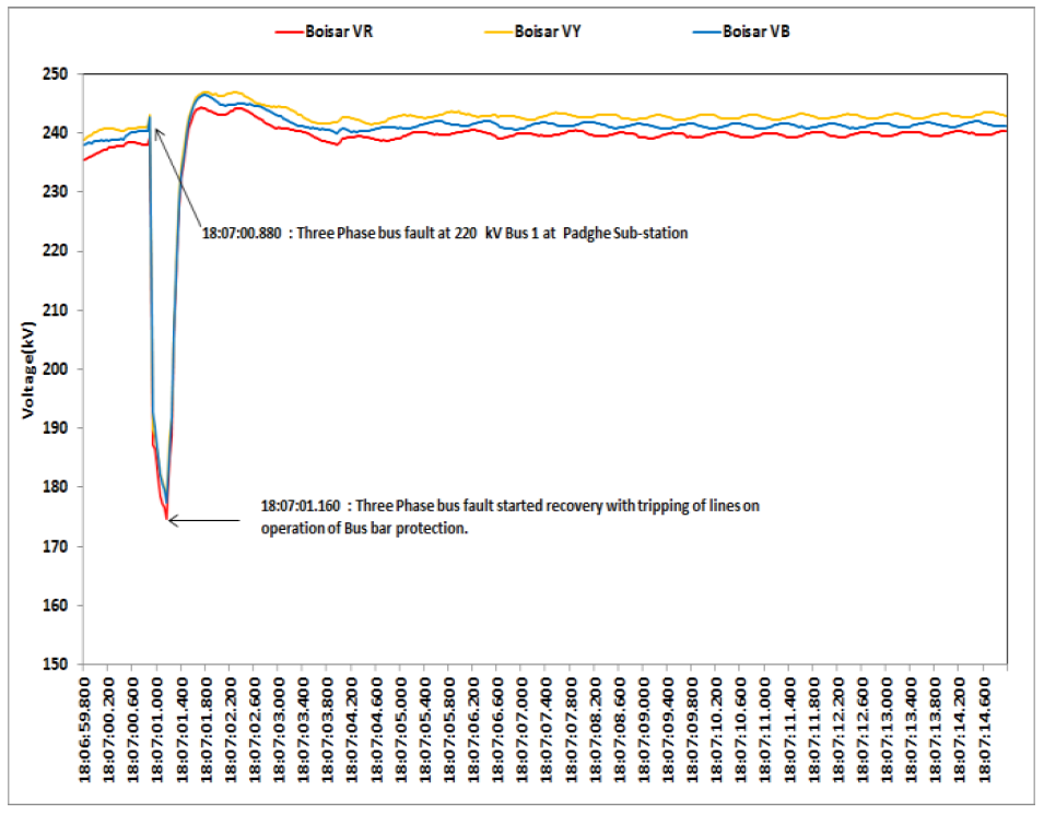 Previous Image Next Image figure-10.-voltage-of-400-kv-boisar-bus-during-three-phase-fault-on-220-kv-dehgam-gandhar-circuit-2-from-synchrophasor-data