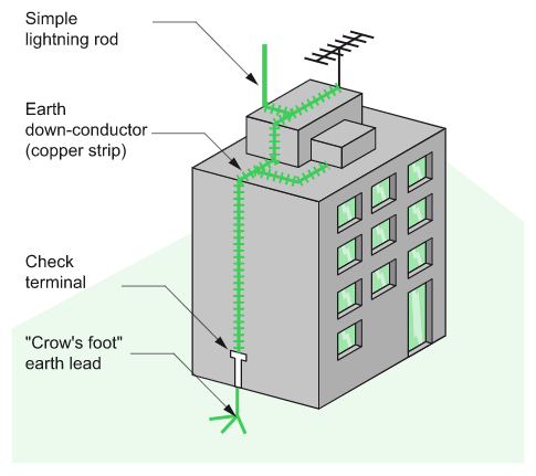 The lightning rod is a metallic capture tip placed at the top of the building. It is earthed by one or more conductors (often copper strips) (see Fig. J12).