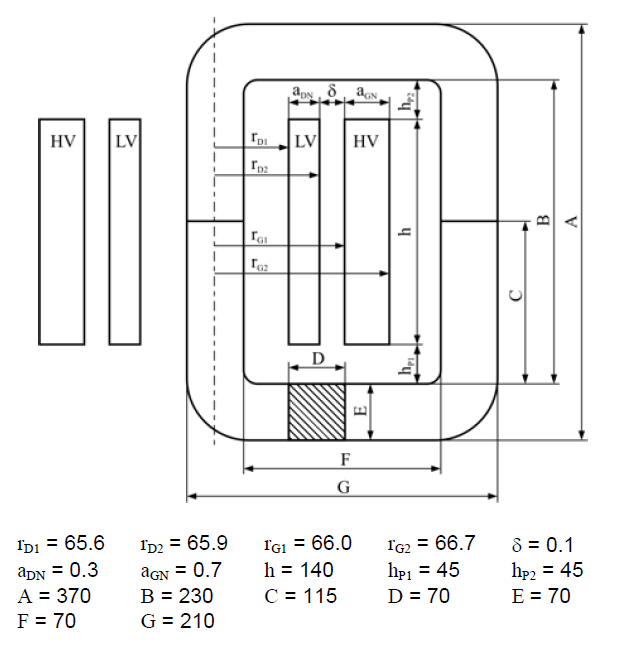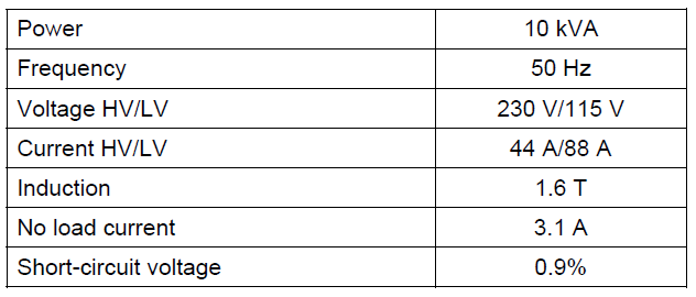 The trials were executed on a one phase HTS transformer of 10kVA power. The core was done as wound and cut with metal sheet PN ET52-27 of induction B=1.75 T with H=10 A/cm and loss of P=0.8 W/kg at B=1T and f=50 Hz. The transformer’s primary and secondary voltage windings were made of superconducting tape Super Power SCS4050 (RE)BCO of effective value of critical current of 80 A in temperature of 77K in self field. The tape’s bulk was 0.1 mm, the width 4 mm. The windings were isolated by wrapping the superconducting tape with kapton. The windings geometry was shown in the Figure 1. The transformer’s windings are being cooled by liquid nitrogen to reach the temperature of 77K. The transformer’s core works at room temperature. The rated parameters were given in the Table 1.