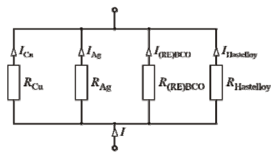 In the superconducting state all the current flows through superconductor. Calculations show, that in resistive state of the SCS4050 tape, at temperature of 77K, 89% of current flows through Cu layer, 9.4% through the Ag layer and 1.5% through the Hastelloy layer. With temperature growth, the resistance of layers materials changes. In addition, the reflow of current changes. At 293K we get 88.7%, 9.5%, 1.5% respectively.