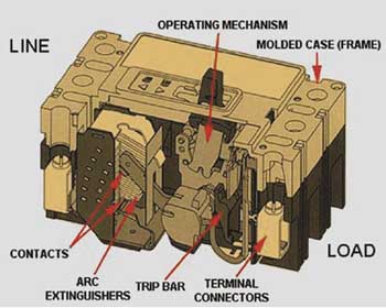 An outline of a three-phase molded-case circuit breaker is shown in figure 3. The function of the molded-case (frame) is to provide an insulated housing to mount all of the components. The operating mechanism opens and closes the three sets of contacts simultaneously (common-trip), and is driven by a spring-loaded mechanism. The springs are charged by moving the handle first to the “off” position and then to the “on” position. The motion of a trip-bar trips the mechanism and, in a thermal-magnetic breaker, this motion is again initiated either by a bimetal or by a magnetic trip. In figure 3, each pole contains an electromagnet whose winding is in series with the load current. When a short-circuit fault occurs, the current passing through the circuit conductor causes the magnetic-field-strength of the electromagnet in the breaker to rapidly increase and attract the armature. As the armature is attracted to the electromagnet, the armature rotates the trip bar causing the mechanism to unlatch and the circuit breaker to trip.