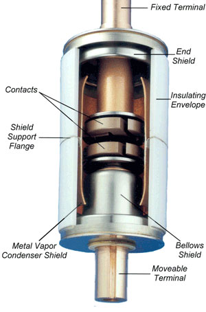The technology of choice for medium-voltage overcurrent protection is vacuum. Here each pole of the 3-phase circuit breaker contains a vacuum interrupter of deceptively simple construction. As indicated in the cut-away view of figure 6, two contacts oppose each other within a vacuum envelope.