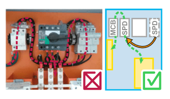 The incoming conductors of the SPD should be remote from the protected outgoing conductors to avoid polluting them by coupling (see Fig. J44).