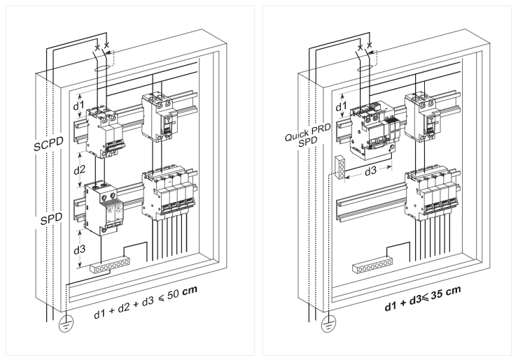 The first rule to comply with is that the length of the SPD connections between the network (via the external SCPD) and the earthing terminal block should not exceed 50 cm.