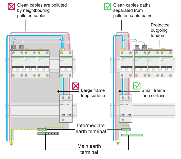 The incoming feeder phase, neutral and protection (PE) conductors should run one beside another in order to reduce the loop surface (see Fig. J44).