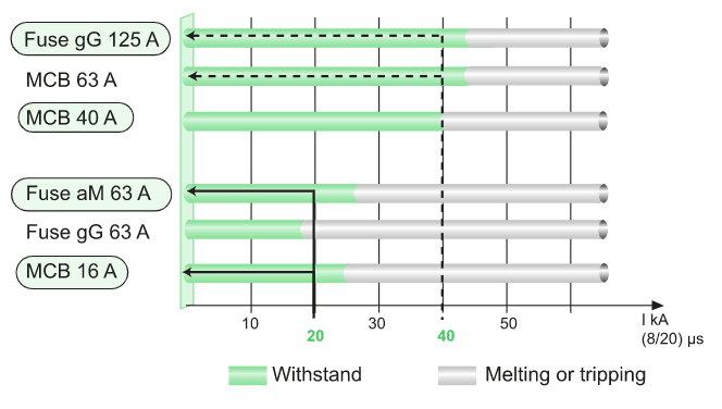 • to protect a SPD defined for Imax = 20 kA, the external SCPD to be chosen is either a MCB 16 A or a Fuse aM 63 A,