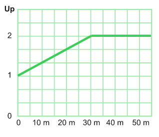 Modelling of the phenomenon applied to a lightning wave and tests in laboratory showed that a load powered by 30 m of cable protected upstream by a SPD at voltage Up sustains, due to reflection phenomena, a maximum voltage of 2 x Up (see Fig. J59). This voltage wave is not energetic.
