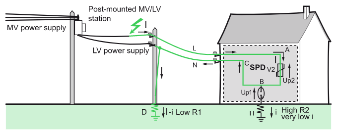 The lightning current flows through circuit ABH which has a lower impedance than circuit ABCD, as the impedance of the component used between B and H is null (gas filled spark gap). In this case, the differential voltage is equal to the residual voltage of the SPD (Up2).
