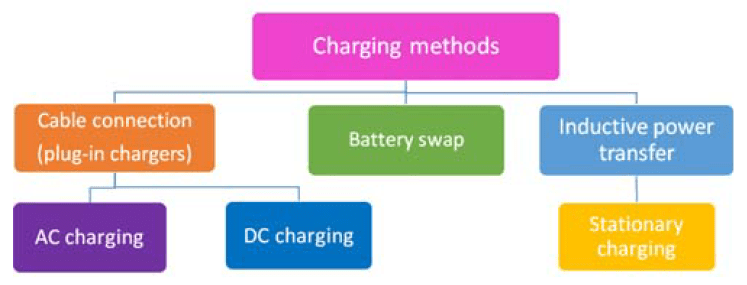 The simplest method to classify electric cars is by their charging methods (Figure 2) or in terms of the energy source used for their drive, for example, BEVs (battery electric vehicles), FCEV (fuel cell vehicles). Producers of electric vehicles and charging stations are racing to develop the most convenient solution for users which will ensure that the time taken to charge batteries is similar to the time taken to refuel a traditional car. However, due to the lack of a uniform international standard, manufacturers launch solutions for chargers dedicated to specific car brands (CHAdeMO, CCS, Supercharger). This means that all users cannot use all charging points, or they must purchase special adapters to use chargers not specific to their vehicles.