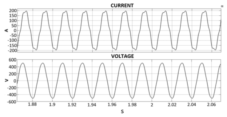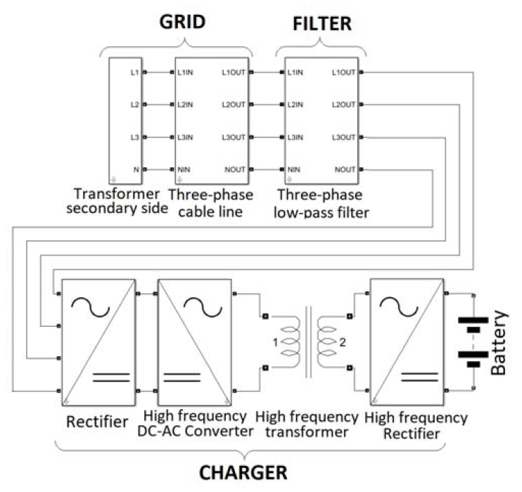 The modelled DC charger was supplied from a three-phase grid with a nominal voltage of 400 V. The real distribution grid was mapped in the simulation model (transformer and cable line parameters). The modelled block diagram is presented in Figure 6 and described in detail [33]. The network was loaded by only one device which was the DC charger.