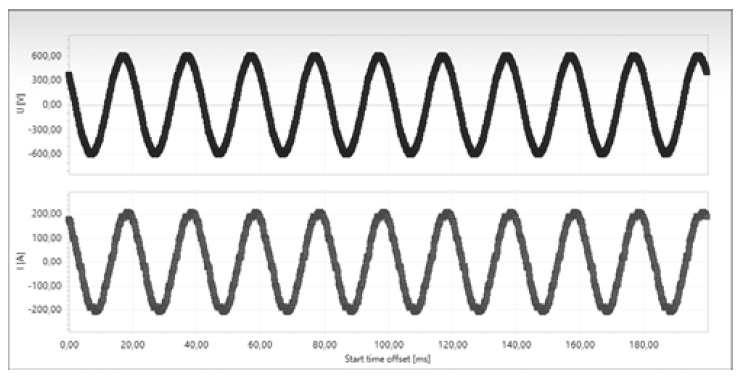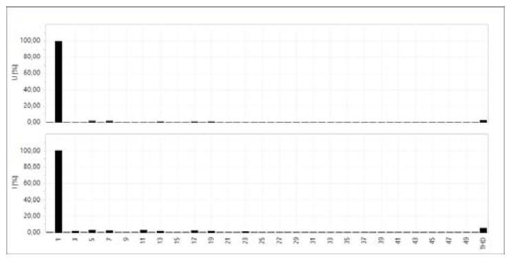 During charging, the total harmonic distortion (current), THDI was about 7.8%, which even with a significant current drawn from the network had little effect on the total harmonic distortion (voltage), THDU, which did not exceed 2.2%.