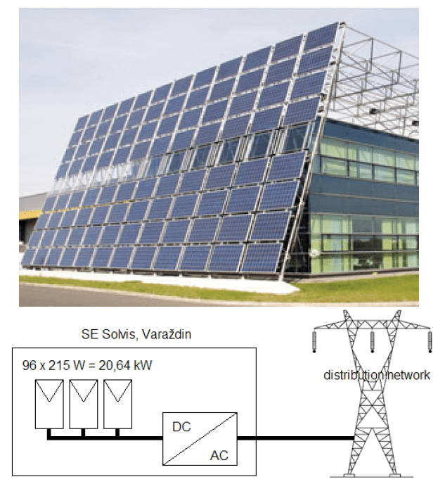 The Solvis SE PV plant (Fig.1) is located in Varaždin in the north of Croatia, with geographical coordinates 16.3245° east and 46.3245° north and elevation of 170 m. The climate is temperate continental. The PV plant consists of 96 PV modules with 215 W of electrical power, which are installed in a fixed mode and connected to the commercial electrical energy distribution network. Efficiency of the DC/AC inverter is 96%. The PV plant DC power is 20.64 kWmpp defined for 1000 W/m² irradiance on the PV modules surface and temperature of 25°C. The PV plant orientation is not optimal. The azimuth is set to 0° (south) and inclination to 70°. The albedo is estimated as 0.26.