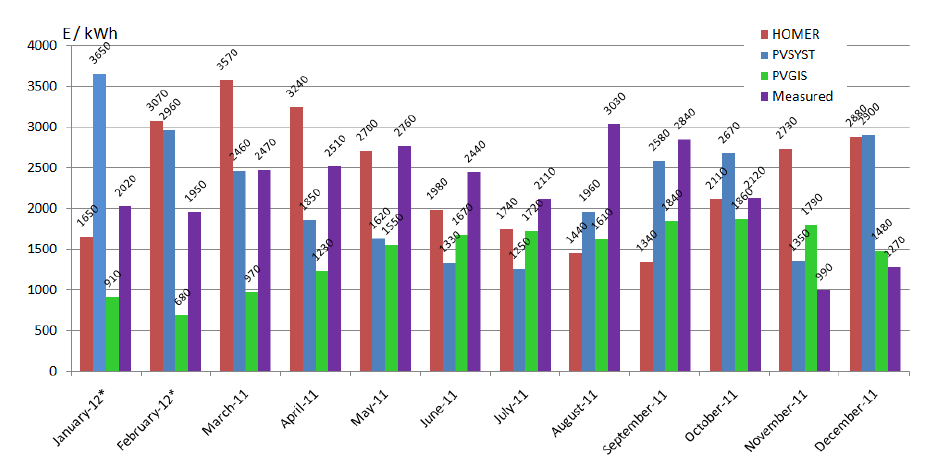 A comparison of each model with the measured monthly results shows that all models can have significant monthly and/or annual errors in energy production estimation. While the PVSYST and the PVGIS both have multiple monthly errors over 100% of the measured energy production in a given month, the Homer never exceeds that percentage of error for each month in the given year. It can also be seen that all model calculations for warm weather are lower than real energy production, while in cold weather model results are always higher than real energy production. The PVSYST calculated the most accurate annual results, while the Homer and the PVGIS have some errors. When all of these characteristics combine, the Homer proves to be a rather good model with some deficiency which must be considered. The Homer model has been selected for implementation of corrections that will result in better hourly predictions based on its single monthly predictions. These corrections should finally result in better daily, monthly and annual energy production predictions.