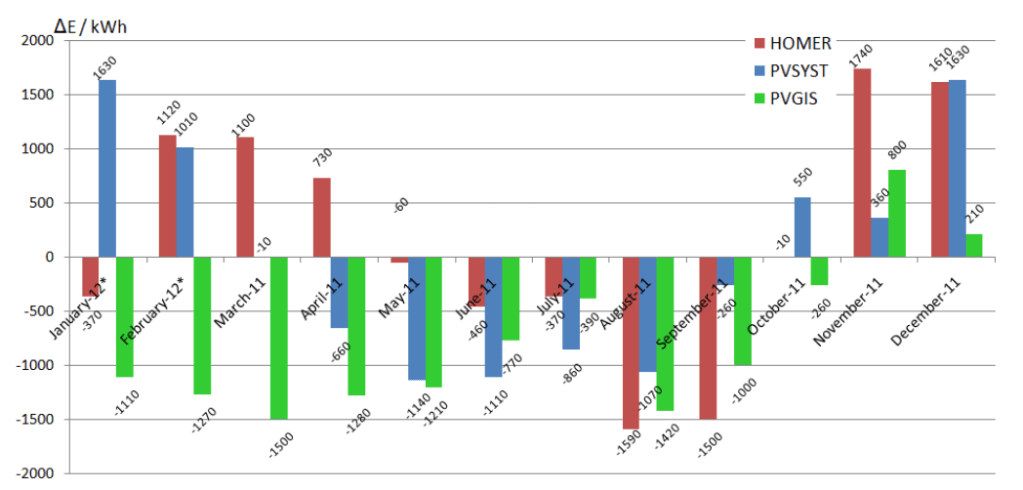 Monthly energy production model errors are presented for each model regarding the measured values. The PVGIS result errors generally underestimate energy production. These results are expected considering the empirical modelling which is affected by the used equipment. The equipment used for the selected PV plant is not used in the PVGIS model. The PVSYST and the Homer monthly errors are rather significant in some months, but they also oscillate around zero during the one year period. The Homer model results have five monthly absolute result errors smaller than 500 kWh, while the PVSYST has only two months in that range. Therefore, it can be concluded that synthetic modelling of hourly data used by the Homer is more accurate than the one used in the PVSYST model. While the PVGIS calculates energy production results from empirical data, the Homer and the PVSYST model use synthetic hourly data from monthly averages. In the synthetic data temperature values are used as a constant for every hour, and have a value of monthly average. Modelling factors are also calculated from average annual data. Errors are partly caused by the measured period which was not close to annual averages.