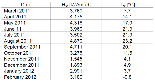 The input data for modelling of PV plant energy generation with conventional analytical models are generated from the PV plant database. The input values are presented in Table 2 for each month from March 2011 till February 2012.