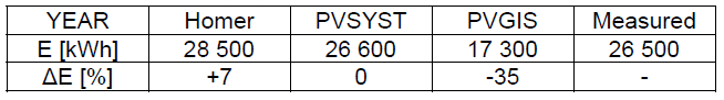 Cumulative annual energy results for the Homer, the PVSYST, the PVGIS and the measured results are presented in Table 3. Relative energy production errors are also presented in comparison with the measured energy of the PV plant. The greatest annual energy production error is the one made by the PVGIS model. The PVSYST model has annual energy production error under 1% and is the most accurate. The Homer annual result is also rather accurate in comparison with the PVGIS model result. Therefore, it can be concluded that the Homer and the PVSYST models predict annual energy production with the acceptable level of precision.