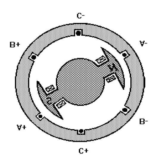 A mechanical force, such as water, steam or wind, is used to provide the rotation to produce this changing flux. Figure 2 is a cross-section of a three phase, 2 pole generator. Half of the windings for each phase are located on opposite sides of the stator, or stationary part of the generator. When these coil pairs (A+/A-, B+/B-, C+/C-) are joined together, the current can flow through the circuit of the windings. In the center is the magnet, which has a north and south pole. The magnetic flux gets stronger as the rotating pole gets closer to the coil, and then reduces in intensity as it goes past. The north pole makes the current flow into one coil and the south makes it flow out of the other. In some generators, the magnets are actually electromagnets, not permanent magnets.