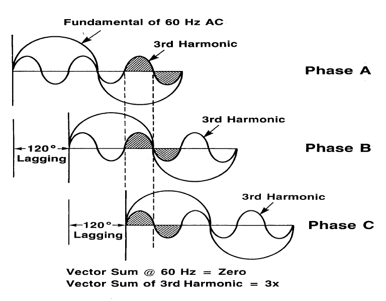 • Excessive neutral current, resulting in overheated neutrals. The currents of triplen harmonics, especially the odd harmonics, (3rd, 9th, 15th,…) are actually additive in the neutral of three phase wye circuits. This is because the harmonic number multiplied by the 120 degree phase shift between the three phases is a integer multiple of 360 degrees, or one complete cycle. This puts the harmonics from each of the three phase conductors “in-phase” with each other in the neutral, as shown in Figure 1.