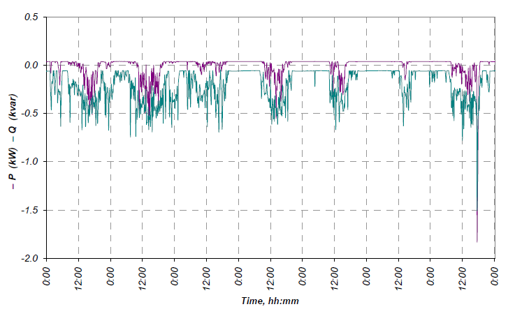 The power inverter control system requires continuous supply of active energy E+ (blue), even when it is working at wind speeds below the turbine start-up speed. The amount of active energy consumed during the test week was 5,36 kWh and the amount of reactive energy was EQ (purple) (7.50 kvarh) – Fig. 8. The total net amount of energy supplied to the grid was E+ = 2.08 kWh (green), but is has to be kept in mind that the measurements were taken during summer, and the wind speed attested at that time was not optimum for the operation of the wind turbine.
