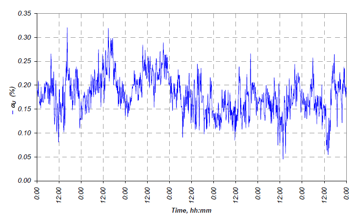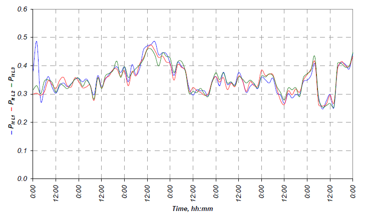 Figure 6 presents the voltage coefficient curve. With the maximal value of the coefficient αUmax = 0.32%, it is significantly smaller than the limit value of 2%. It was also observed that the value of current asymmetry coefficient varies from 1.78% at Pmin to 100% when no power is generated and only the phase L3 is under load due to the power inverter being powered from this circuit. Figure 7 presents the variation of the indices Plt The values of the index Plt are within the interval 0.25 – 0.50, whereas the values of the index Pst are included in the interval 0.07 – 0.67. According to [8], the values of the indices Pst and Plt do not exceed the limit values, as specified in [3]: