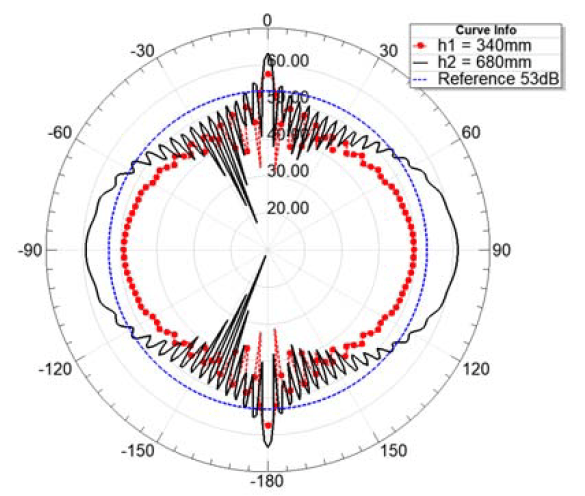 Fig. 7 and 8 show the results of mechanical harmonic analysis at two specific points on the transformer. These figures show the spectrum of x-, y- and z-component of the acceleration. As the modal analysis has shown, one of the resonance frequencies of the active part and the tank is close to twice the excitation frequency. This is also supported by Fig. 7 and 8, because one of the peak values of the acceleration spectrum is at 100 Hz. The tank top has another peak in the spectrum at 150 Hz. Based on this information, the sound pressure level is analysed at 100 Hz. Fig. 9 and 10 summarize the simulation results from the acoustic field simulation. These figures show the sound pressure level at 2 m from the tank wall. 0 degrees and – 180 degrees indicate the centre of the shorter side of the transformer. Reference line shows the 53 dB, which is the noise level of this transformer based on datasheet. These results also support that the accuracy of the result obtained by the numerical simulation is acceptable. As shown in the figures, the sound pressure reaches 60 dB in the 680 mm case. When using A-weighting [13], the sound pressure level increases as shown in Fig. 10. Based on the results, it can be stated that the analysed transformer meets the requirements, but its noise level can be reduced by proper design.