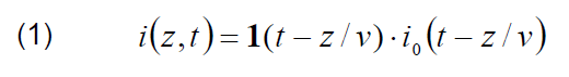 where: 1(t) is the Heaviside function equal to 1 for t ≥ z/v and zero otherwise; v is the upward propagating return stroke velocity; i0(t) is the current at the base of the channel.