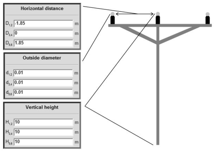 The geometrical data of the conductors of the overhead line are represented in Fig.6, where the subscripts of H, D and d refer to the pins corresponding to the line ends.