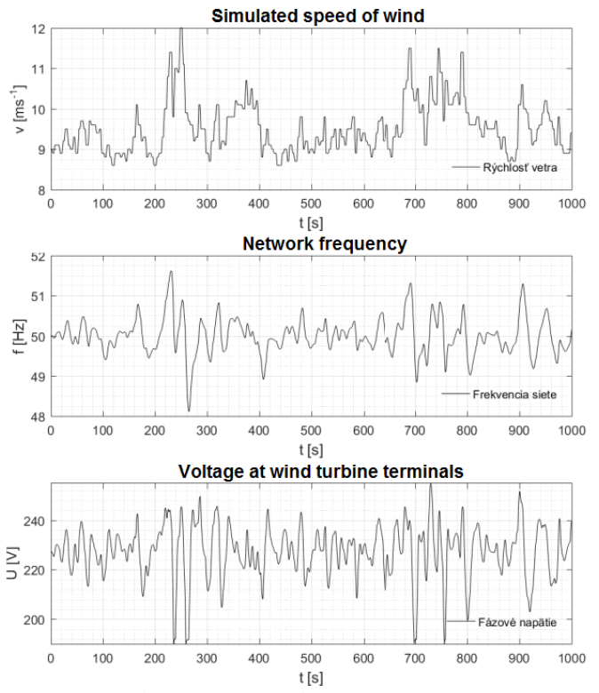 Wind simulation was used to simulate the wind-flow circuit as it is illustrated in Fig. 10. The wind loaded from the text file has a value of 9 m·s–1 at time t = 0, which is the nominal wind for the wind turbine used. Subsequently the wind varies around this value. Wind reaches a maximum value of 12 m·s–1. The wind turbine operates with winds ranging from 4.5 m·s–1 to 12.5 m·s–1.