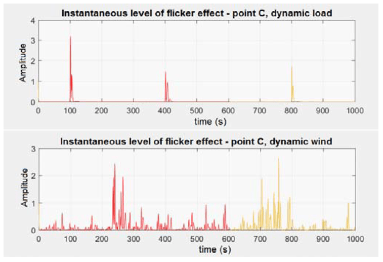 The Fig 11 shows the measured instantaneous level of the flicker effect at the load point C for dynamic load simulation (Fig. 9) and the dynamic wind simulation (Fig. 10). From Fig. 11, it is apparent that the blink effect was occurred in the case of dynamic load simulation at a time when the load was connected or disconnected in the network. It was observed for example, at time t1 = 100 s when a load of 30 kVA was disconnected at the load point B or at time t2 = 400 s when a load of 20 kVA was connected at the load point C or at time t3 = 800 s when the load of 20 kVA was disconnected from load point C. In the case when the dynamic wind acts on the wind turbine (see Fig. 10), the measured instantaneous level of flicker effect will appear as a stochastic noise.
