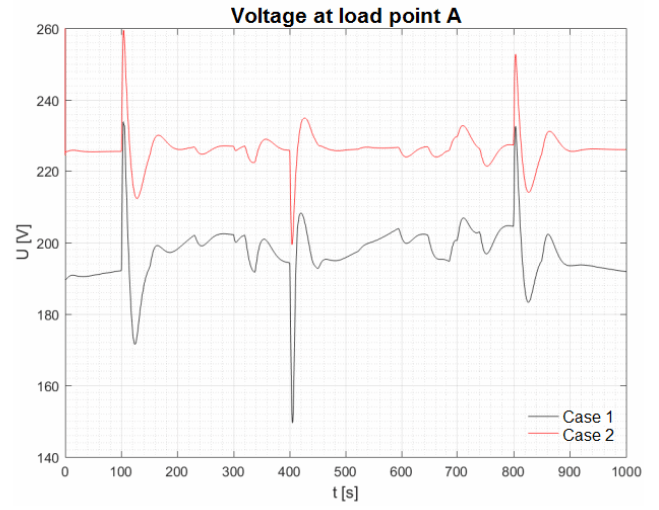 In Fig. 12 is the voltage characteristics at the load point A in the case where was considered constant wind of 9 m·s– 1 during the whole simulation and the dynamic load as described in section B. For the case 1 there was considered the original power line whose resistance was Ra = 0.2010 Ω and inductance La = 355.5 µH. In case 2, a point A was connected by a line with parameters Ra = 0.0134 Ω and La = 23.7 μH. From Fig. 12, it is clear that in case 1 there is a greater voltage fluctuation at the terminals at the load point A as in case 2. For example, during the disconnection of the 20 kVA load from the load point C, there was observed (in case 1) at the load point A the short-term voltage drop from Uf = 194.3 V to Uf = 149.5 V, which is a drop of ΔU = 44.8 V. In case 2, there was drop from Uf = 225.7 V to Uf = 199.4 V, which is drop of ΔU = 26.3 V. As there is less voltage fluctuation in transient phenomena, the resulting flicker effect will be less. In test example 2, the value of the Short Term Perceptibility (Pst) of flicker effect in point A was Pst = 0.335491 (the original value, in case A was Pst = 0.523317).