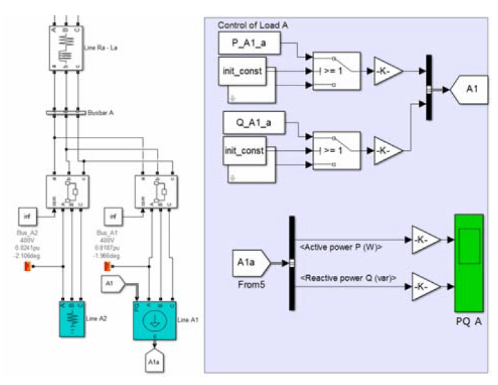 The loads were read using a Matlab script. In Fig 6, a proposed load block for the supply point A is shown. On the left, the load A1 and line A2 are shown, which are connected to the system via a three-phase circuit breaker and a power line simulated by the impedance Ra and La. Line A2 consists of a purely ohmical load, because the dynamic load line A1 cannot be connected in series with the inductive element of the three-phase line, which is the supply point connected to the system. On the right, the reading of block of line load A1 is displayed. If init_const = 1, the load, i.e. line A1 is set according to the vector from a text document. If init_const = 0, the load is set to the constant value, which is set in the text document for time t = 0. Current and voltage measurements were performed on bus-bar A. During the simulations, four consumption points A, B, C and D were considered. Each of these consumption points represents a part of the network. In some simulations, only static three-phase consumption points were used that were disconnected by a three-phase switch.