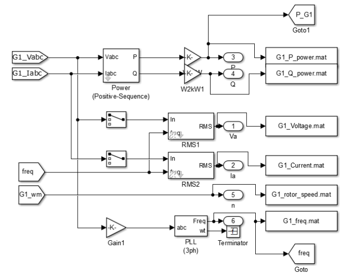 In the simulations, electrical quantities were measured at selected locations in the network. Phase currents and voltages were measured using three-phase V-I measuring blocks, which were placed before loads and before the generators, resp. other sources. The measured output is the sinusoidal voltage/current depending on the time that has to be converted to the effective value (for comparison purposes). The scheme for measuring of the particular variables at the output of the G1 generator is shown in Fig. 7. The RMS current and voltage values for the L1 phase and the active and reactive power in the L1 phase were calculated from the measured currents and voltages.