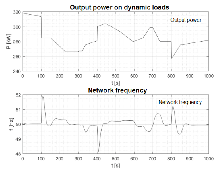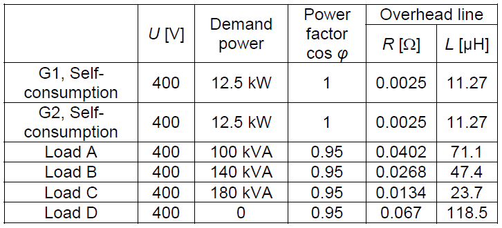 In Fig. 9, the consumed power is indicated by dynamic loads. Self-consumptions (2 x 12.5 kW) and parasitic loads to dynamic loads (3 x 9.5 kW + 4.75 kW), which are purely resistive, have to be added to the total output power. These parasitic loads are in the system because dynamic loads and synchronous generators cannot be in series with an inductive element of three-phase power lines. Those are described by the RL parameters listed in Table 3.