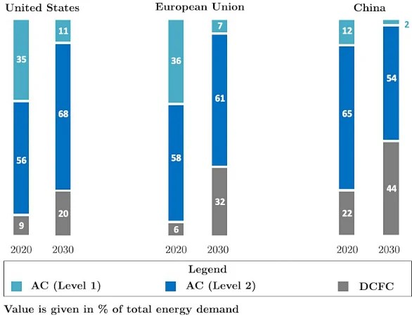 Figure 1 shows that the energy demand for EVs is set to go up drastically in the near future. The energy demand is considered in three emerging economies that will boost the adoption of EVs. The illustration in Figure 2 throws light on the importance of fast charging in the coming years. Fast charging is on the roadmap of every emerging economy to boost EV usage. The level 2 and DC fast charging will witness a surge in its share of the total energy demand as time passes.