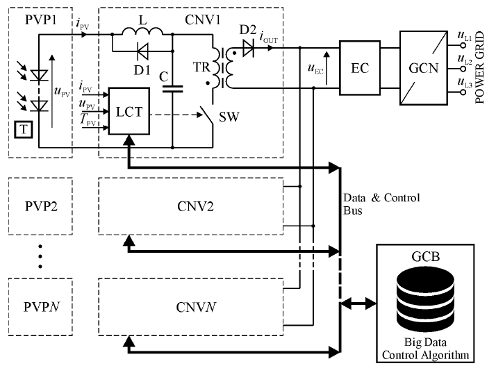 The system consists of the following blocs: set of low voltage photovoltaic panels (PVP) in the number of N , set of low power converters (CNV), where an individual converter is coupled with a single PVP, energy container (EC) – based on LiION cells, power grid side converter (GCN), coupling EC with a power grid, and global control block (GCB), including dedicated big data control algorithm (BDCA). The individual converters are connected to GCB via isolated data-control bus.