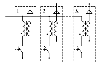 In the extended version of the system (Fig. 2) the CNV block contains a larger number (i.e. K) of lower power flyback converters, being connected in parallel. If power transferred by a single flyback converter reaches its nominal capacity, another converter is switched on, etc.. Thank to this they operate in conditions, being close to nominal ones. As a consequence, it is expected, that overall system’s efficiency will grow. Moreover, an order of turning on of another converter is not fixed. This one bases on pseudorandom algorithm. So, the expected system’s lifetime should increase.