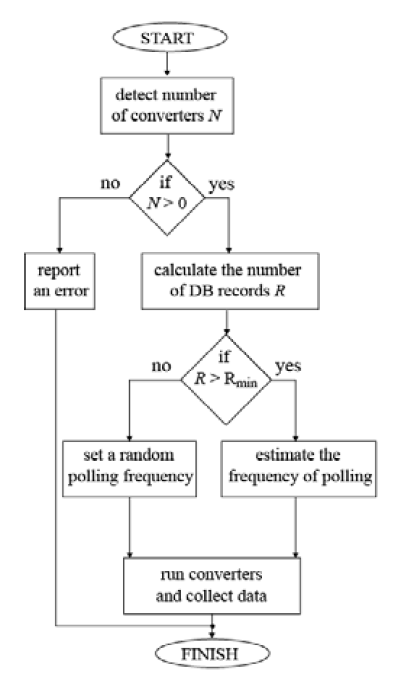 In order to meet these requirements, a set of algorithms responsible for the operation of the system was developed. The first of the described algorithms is the algorithm controlling the system startup section – shown in Fig. 3. The system should operate independently. Therefore, the detection of the number of DC / DC converters with which it works is crucial in the start phase. If this process is completed successfully, the system will proceed to database analysis. However, if the system does not detect the connected converters or does not communicate with them, the user will be informed about the system error.