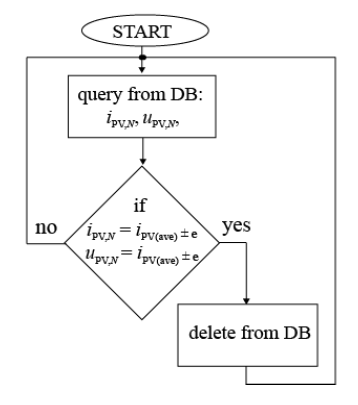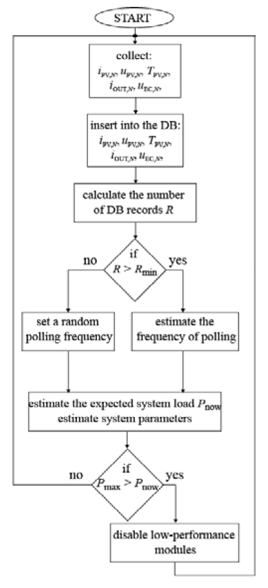 The main task of the algorithm is to collect data and save it to the database. Then, based on the data collected in the database, the average polling time of system components is updated. Next, the demand for system power is determined. If this demand is lower than the power of the whole system then the algorithm can turn off the least effective elements of the system. The reason for low efficiency may be shading, dirt or breakdowns. This algorithm operates in a closed loop and its operating frequency is automatically selected.