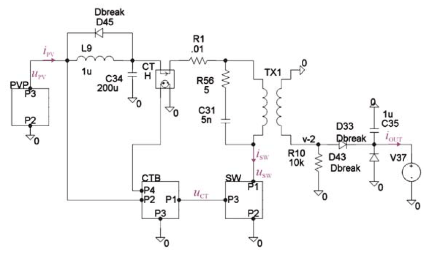 Functionality of main blocks in the simulation model is as follows: PVP is PV panel’s model (PV contains three small PV cells connected in series), SW is the power switch model, and CTB is the control block model. The pulse transformer’s model (TX1) was based on a real planar transformer with ferrite core type EEQ30 (N97 material) from TDK. The power switch model was based on modern OptiMOS™ 5 100 V power MOSFET type BSZ146N10LS5 manufactured by INFINEON [8]. Thanks to suitable design of the pulse transformer (both a flat core and multilayer windings) its coupling factor is close to 1 ( k ≅ 0.995). Thus, taking into account, that magnetizing inductance is equal to ~25 µH, the leakage inductance (associated with the primary winding) is equal approximately to 100 nH. As a result, a form of the snubber circuit (R56-C31) can be very simple.