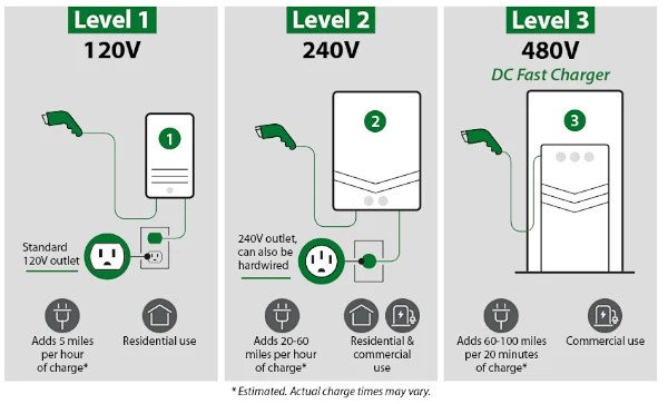 EV charging can be categorized into three different Levels with different power outputs and charge rates: