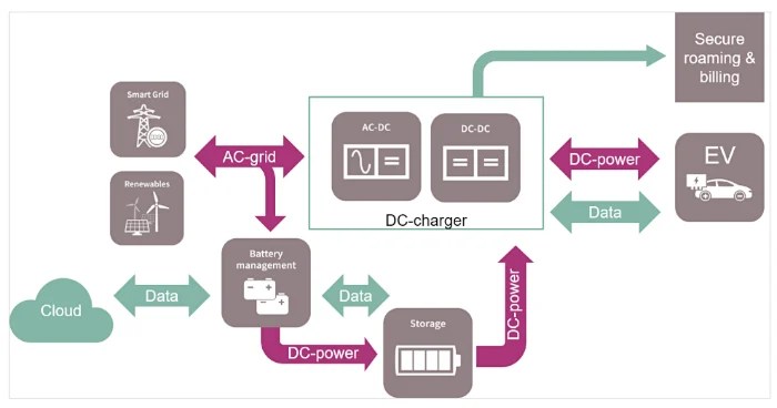 Most EVs have an AC/DC converter on board that converts external AC power (Level 1 and 2 charging) to DC for charging the battery powertrain. However, in the case of fast DC charging, utility power is converted to DC externally, so the EVs internal AC/DC converter is bypassed allowing the batteries to be charged directly. In this manner, much higher rates can be achieved since the onboard AC/DC conversion typically limits rates in Level 1 and Level 2 applications.