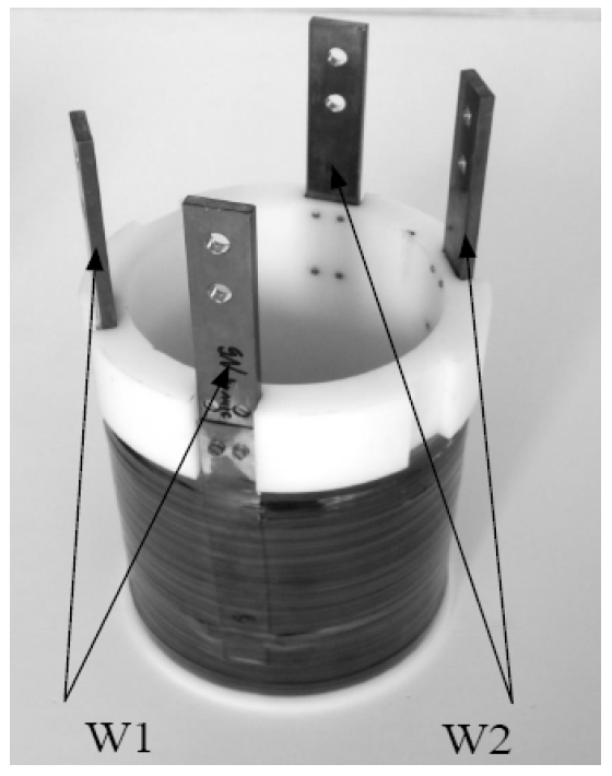 Both windings are made of HTS 2G SCS4050 superconducting tape produced by SuperPower. This is a tape with a width of 4 mm and a thickness of 0.055 mm [16],[18-20] laminated on both sides with copper, with a critical current Ic = 150 A. Maximum rated current of the superconducting windings is equal to the effective value of the critical current of the superconductor amounting to 82 A.