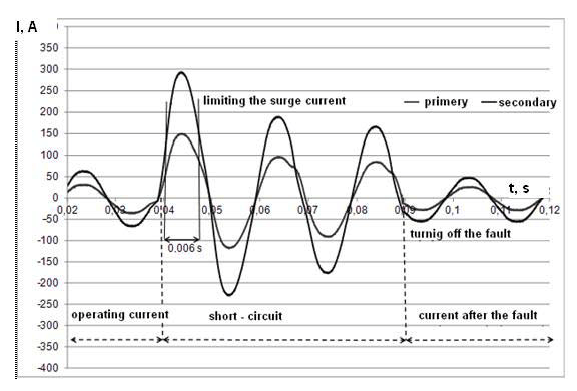 Fig. 7 shows the current waveforms on the primary and secondary side of the limiter for the selected configuration of the windings. After the current in the secondary winding of the Cu transformer has crossed the critical current value of the superconducting winding, the surge current (the first impulse of the short circuit current) is limited to the value resulting from the value of the short circuit impedance of the limiter – ZZW (ISC).