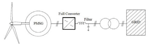 In that wind farm, the wind turbine generators – WTG are connected in three parallel groups, one composed of ten and two of nine units. Figure 1 illustrates the first group with ten wind generators. The other two groups are constructed analogously. Each wind generator consists of a permanent magnet synchronous generator – PMSG, with a full converter, each unit been capable of generating up to 1.5 MVA. In order to meet power quality requirements, the converter is followed by a second-order low-pass filter that helps smoothing the voltage waveform. This LC filter is composed of a series 0.15mH inductor and a shunt 500μF capacitor per phase. A scheme illustrating the PMSG is pictured in Figure 2.