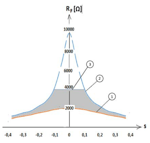 In practice effectiveness of YY0 during operation of RCF device is limited by curve 3. Maximal effectiveness (4000 Ω) can be achieved when detuning coefficient after operation of RCF is reduced to 0,1. Following conditions can occur only when: