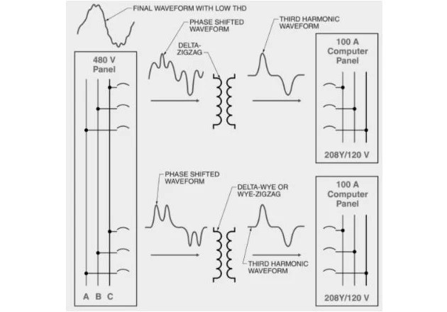 To achieve the best results, the single-phase, line-to-neutral, nonlinear load must be balanced between two panels fed by two separate HMTs. One of the HMTs should be a delta-zigzag with a 0° phase shift. The second HMT could be either a delta-wye or a wye-zigzag with a phase change of 30°. The use of the two transformers would help eliminate the 5th, 7th, 17th, and 19th harmonics. Also, the harmonic attenuation will be more effective when the loads are balanced.
