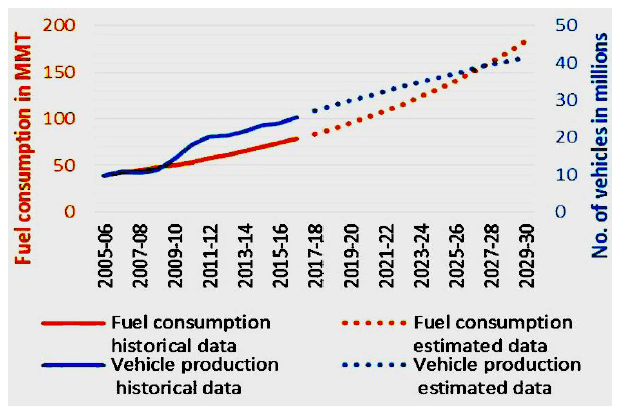 Energy required by utility grid increases as demand in the electric vehicle market. The automobiles production in India is at a CAGR of 5.81% from 2007 to 2018. The vehicles include 80.9% of two wheelers, 13.2% of passenger cars, 2.5% of three wheelers & 3.4% of commercial vehicles [5]. Out of these, close to 99.9% are conventional ICE vehicles which are burning petrol & diesel for traction. The figure 1 shows the historical vehicle production data along with the estimated production volumes by 2030 which is indicated with blue line and also it shows the historical & estimated fuel (both petrol & diesel) consumption in MMT (Million Metric Tonnes) which is indicated with red line.