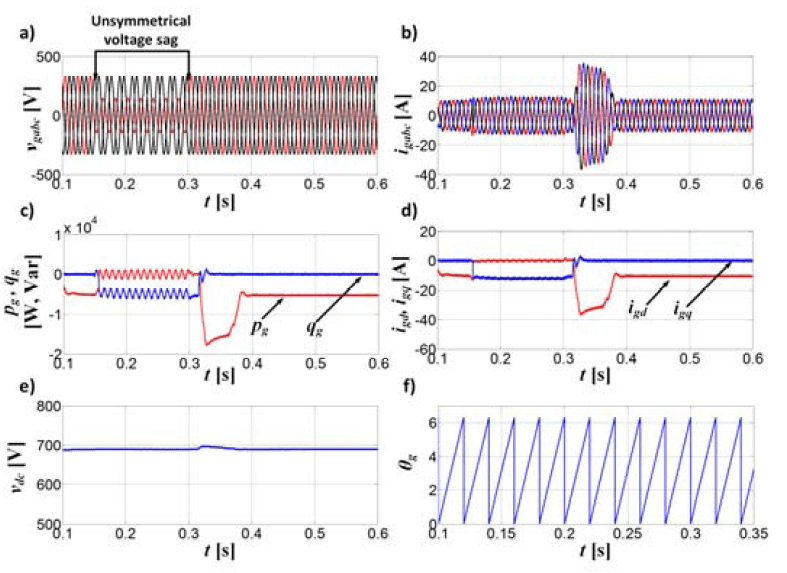 The waveforms of DC link voltage vdc has been presented in Figure 8e. When the voltage sag is occurred, the DC link voltage is regulated by the MSC. In Figure 8f the waveforms of angle position θg of grid voltage vector, obtained from DDSRF have been illustrated. The application of DDSRF allows to determine the proper angle of grid voltage vector during unsymmetrical voltage sags.