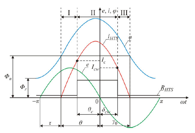 It therefore follows that in the I and III intervals, the inrush current is only damped by the resistance of the supply network Rs. In the interval II, the resistance damping the inrush current impulses is the sum of resistance of the power supply line Rs and resistance of the primary winding R1HTS in its resistive state.