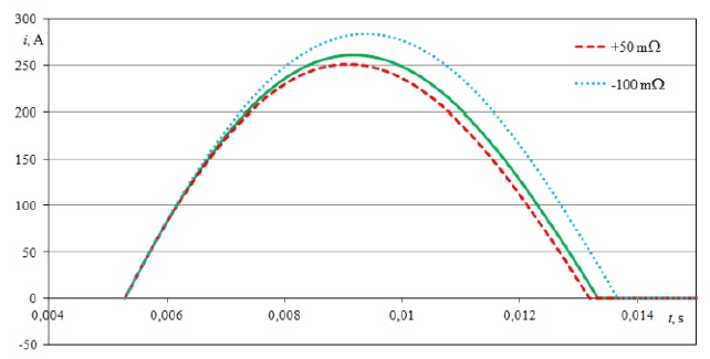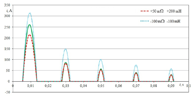 Figure 12 shows the course of the first five impulses of the inrush current with change of the impedance of the power supply line for two cases: 1) when the resistance of the line was increased by +50 mΩ and inductance was increased by +200 mH, 2) the resistance and inductance of the line were simultaneously decreased by -100mΩ and – 100mH, respectively.
